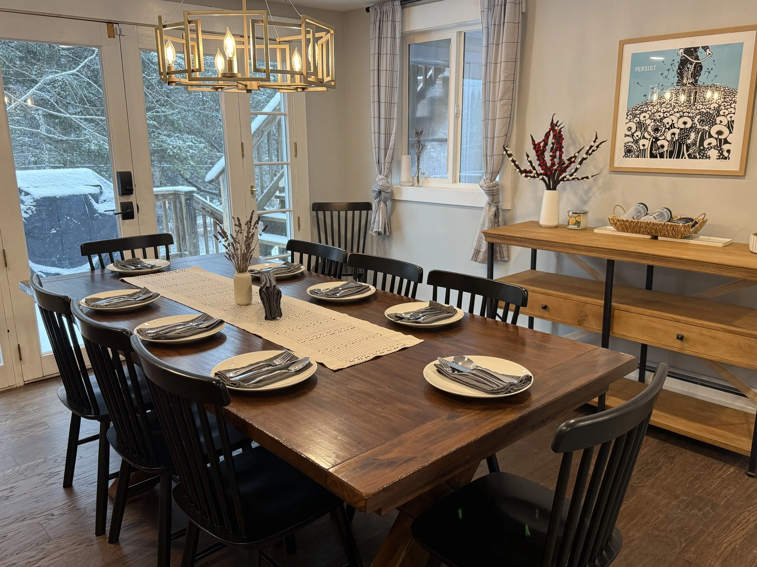Roomy wooden table for 8+ with french doors to side deck with grill and picnic table, upper deck, and dog fenced area.