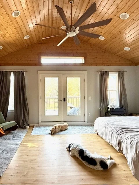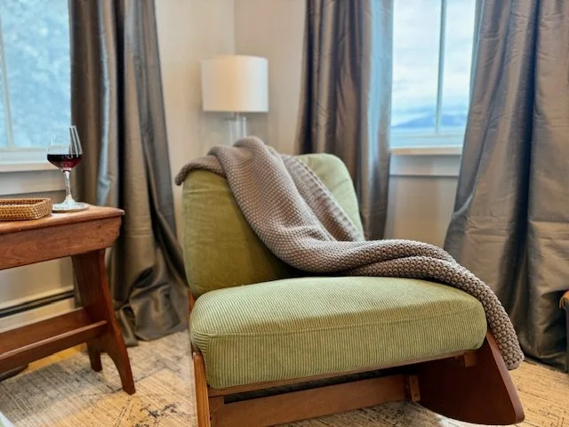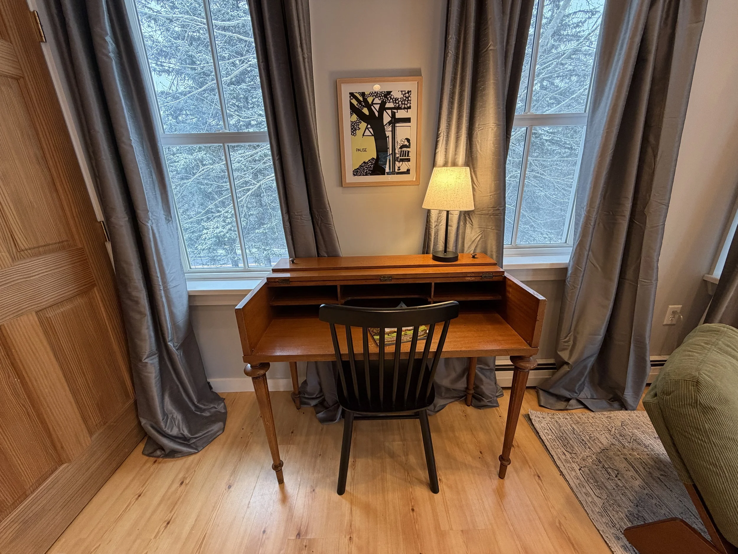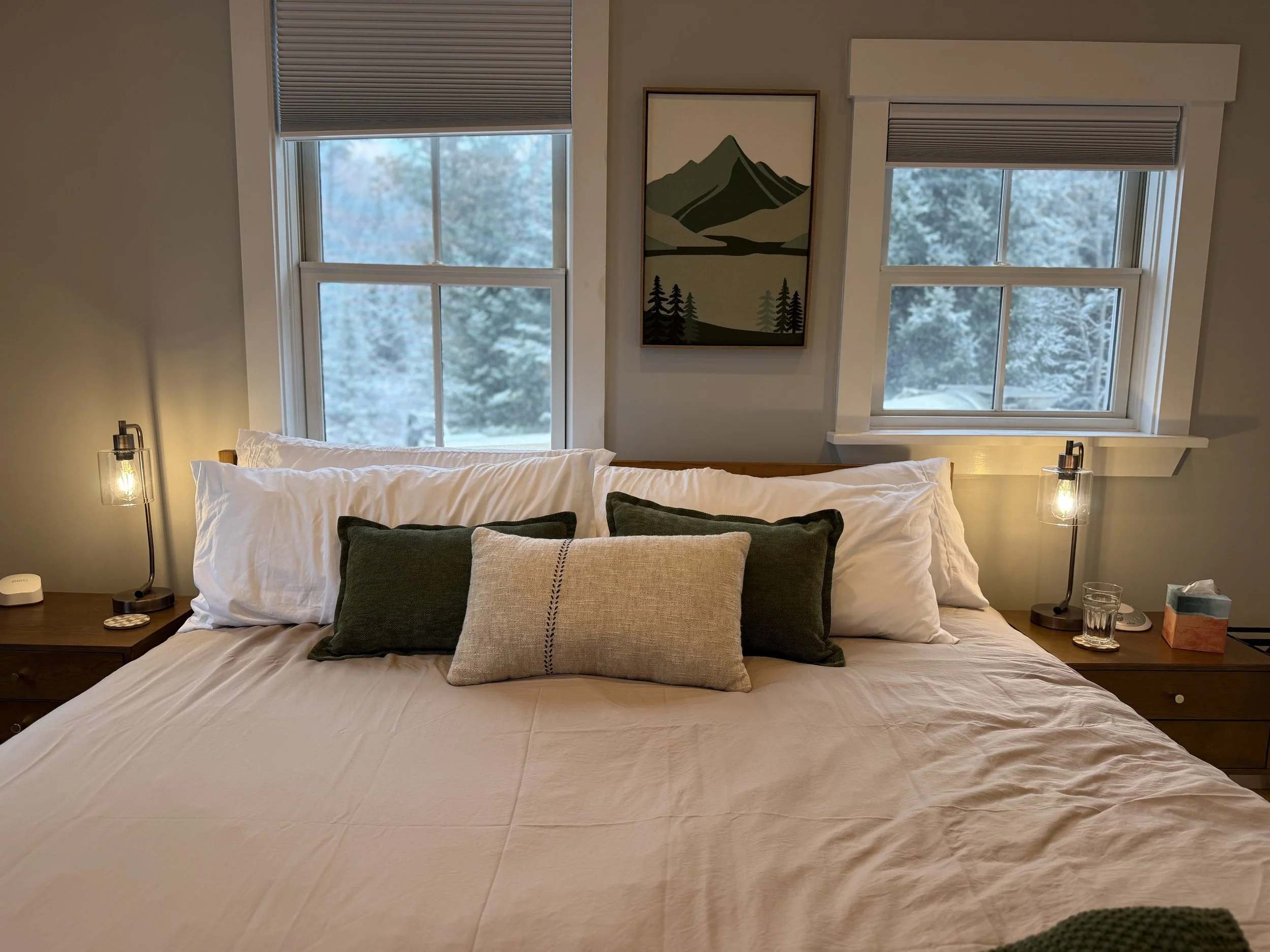 King bed, desk space, TV, intimate seating for two inside or out the french doors to enjoy views of Burke Mountain.