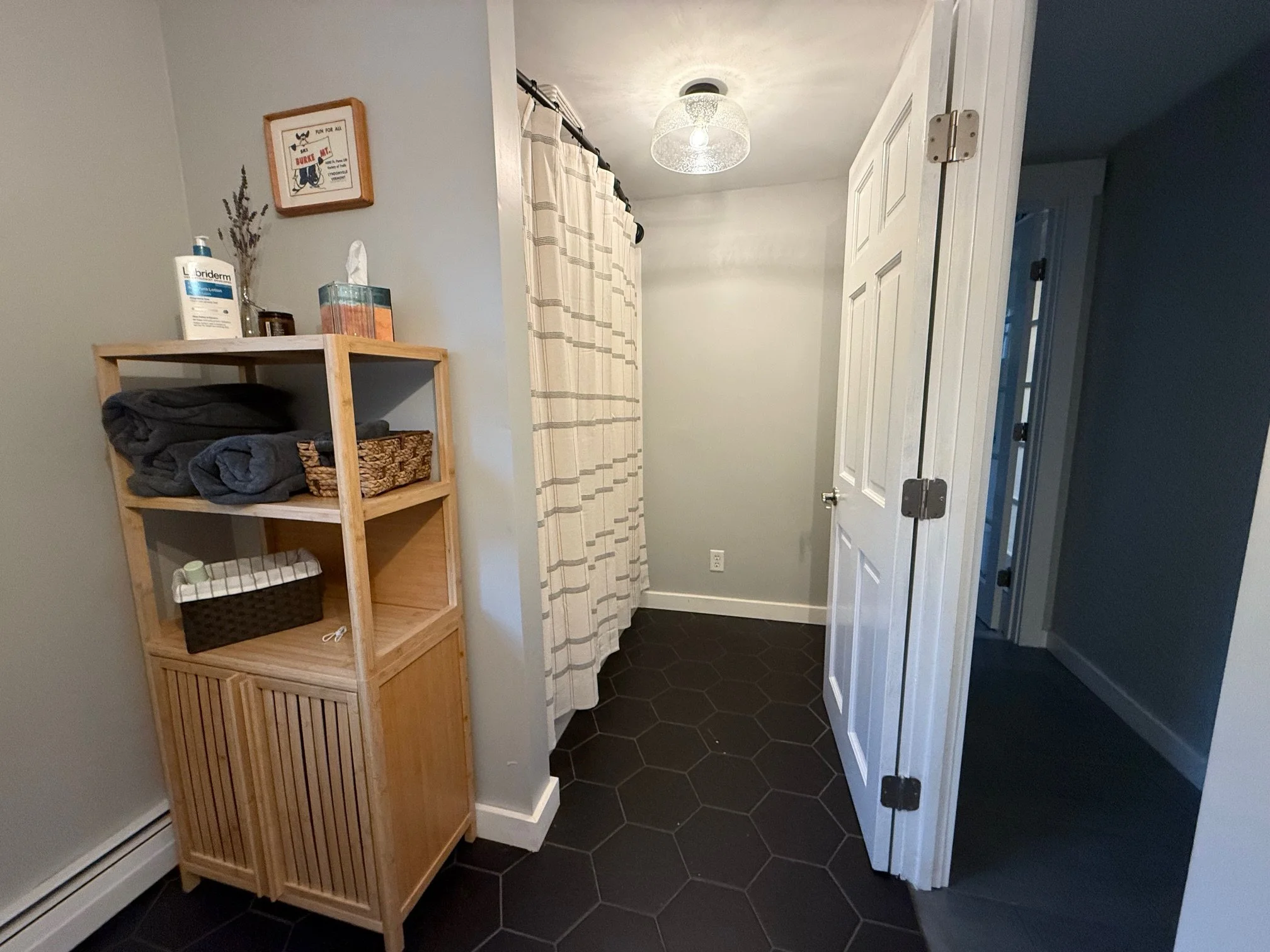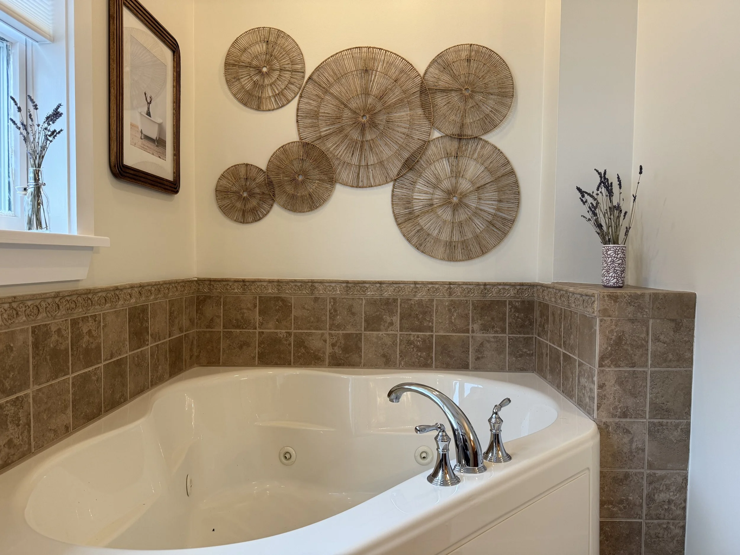 Second floor bath with access from the hall and the primary bedroom. Shower and large soaking tub.