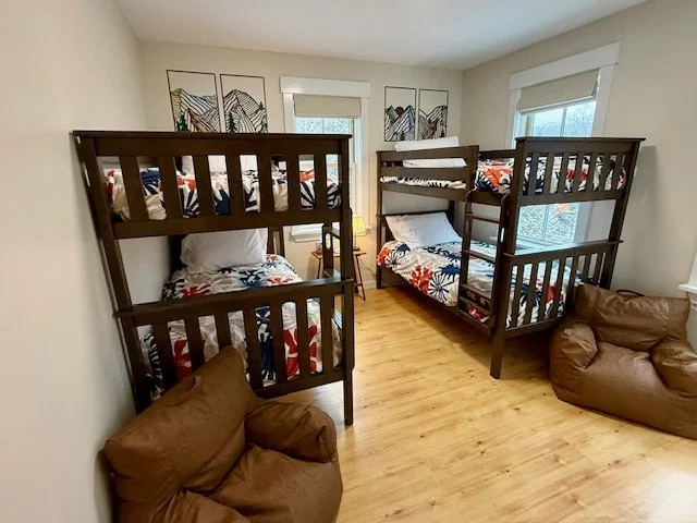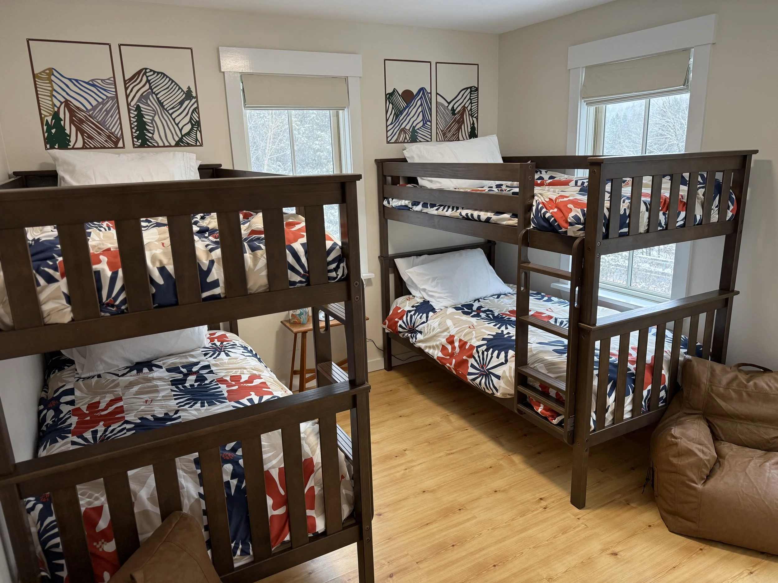 Two double bunks, built for adults but comfortable for any age, and bean bag chairs to offer a second hang-out space.